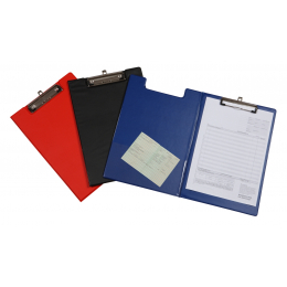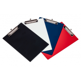 PVC-Klemmbrett mit stabilem Pappkern, Vorder- und Rückendeckel, Blockklemme und Öse, in verschiedenen erhältlich Farben.
