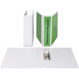 Mit diesen weissen, umweltfreundlichen PP-Präsentationsringbüchern in buchbinderischer Verarbeitung können Sie Ihre Dokumente und Unterlagen archivieren. Ausgerüstet mit Taschen auf Front- und schmalen Rücken können die Ringbücher individuell beschriftet werden. Die Ringbücher sind in verschiedenen Füllhöhen und mit 2- und 4-Ring Mechanik verfügbar.